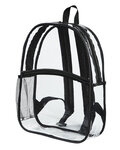 PVC; Clear PVC body; Contrasting binding; Front zipper pocket; Side mesh pocket; Padded adjustable straps; 12"W x 15 1/4" H x 4"D ; Requires California Prop 65 Warning Label;